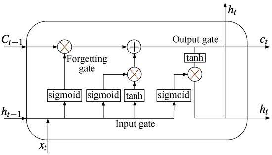 LSTM [30,31,32], a variant of Recurrent Neural Networks (RNNs), is designed to store long-term information and update units by effectively capturing relationships within the data. It addresses the issue of gradient vanishing by efficiently managing long-range dependencies through the use of three gates: the forget gate, the output gate, and the input gate. The internal structure of LSTM is demonstrated in Figure 3. The forget gate, which employs a Sigmoid function, determines the weight for retaining the previous state. A value of 1 means full retention, while 0 signifies complete erasure, as expressed by the following equation: