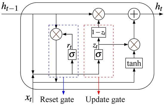 The GRU, a type of Recurrent Neural Network (RNN) variant, was developed to address issues related to short-term memory and backpropagation gradients [31,32,33]. Unlike traditional RNNs, GRUs incorporate update and reset gates, which help integrate both current inputs and past information more effectively. The update gate works in tandem with the reset gate to manage both current and previous data. This structure allows a GRU to better retain long-term dependencies within time series data, thereby mitigating problems such as vanishing and exploding gradients. The internal structure of a GRU is displayed in Figure 4. The reset gate applies a Sigmoid function to convert the previous time step’s state into a value between 0 and 1. This value determines how much of the prior state should be kept, and it can be represented as follows: