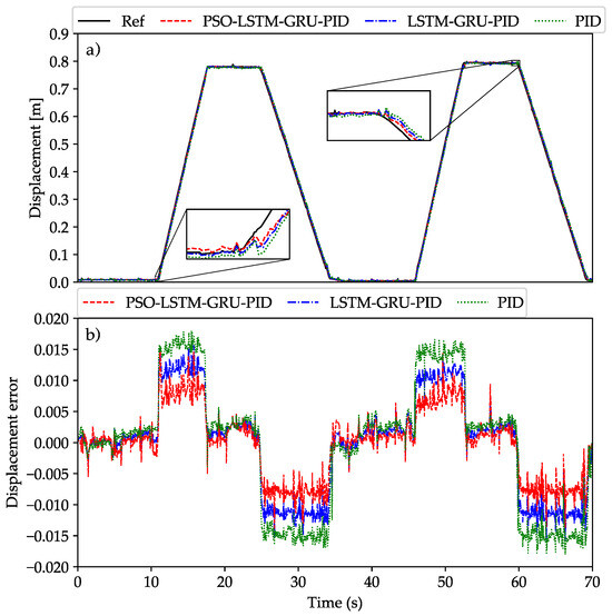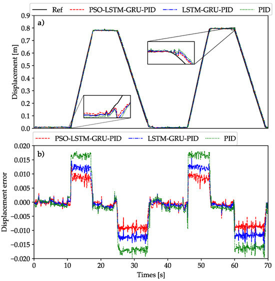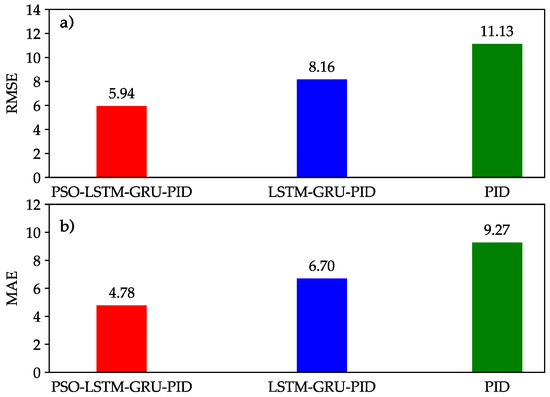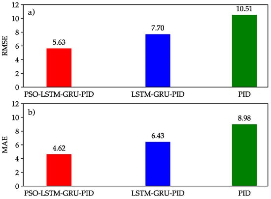 Figure 7 presents a comparison of the boom cylinder’s displacement and displacement error. Throughout the raising and lowering phases of the cylinder, the LSTM-GRU-PID and PSO-LSTM-GRU-PID controllers exhibit superior tracking performance compared to the PID controller. By optimizing the four hyperparameters in the LSTM-GRU-PID controller, the proposed PSO-based controller achieves both superior tracking accuracy and a quicker convergence rate. Furthermore, to maintain a fair comparison, the MAE and RMSE values for the three controllers are shown in Figure 8a,b. The results clearly show that the PSO-LSTM-GRU-PID controller consistently achieves a lower RMSE than the other two controllers, about and of those from LSTM-GRU-PID and PID controllers, and the MAE results follow a similar trend as the RMSE, with the proposed controller showing the lowest MAE value. This demonstrates that the system’s tracking accuracy has been enhanced through the optimization of the control coefficients.
