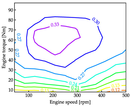 From the speed and torque data, the efficiency of each working point can be determined by leveraging the ICE efficiency map illustrated in Figure 15. Using these data, the energy usage of the ICE is calculated.