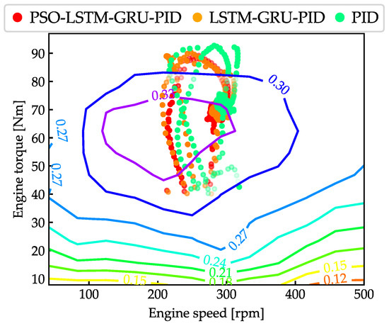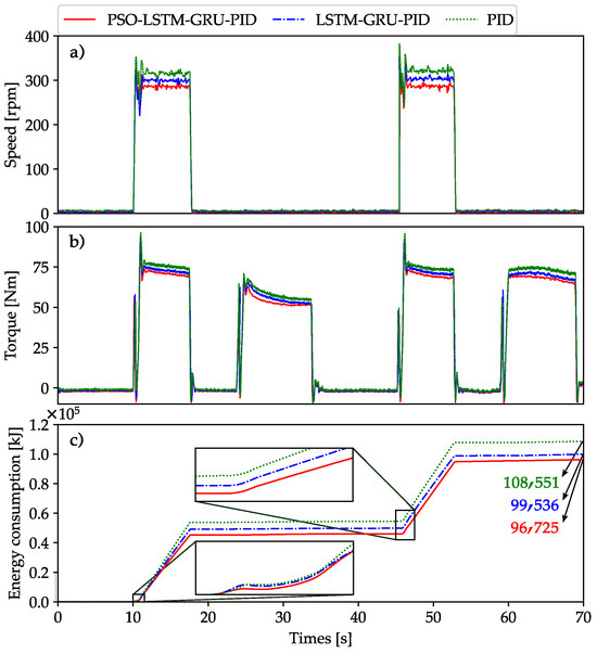 Most of the time, the proposed controller always has better tracking precision. This advantage is achieved through the seamless coordination between the components in the system. Figure 9 represents the speed, torque, and energy consumption of the ICE. Besides tracking accuracy, energy consumption is a key factor in assessing the performance of the proposed controller. When conducting a detailed analysis of energy consumption for each individual mode, the PSO-LSTM-GRU-PID controller consumes 2.376 kJ less energy than the LSTM-GRU-PID controller and 8.85 kJ less than the PID controller. In summary, the proposed controller exhibits excellent energy efficiency for the system.