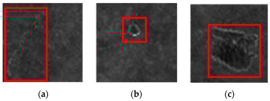 The axial error (ΔX, ΔY) between the IoU of the defect measurement bounding box and the theoretical bounding box, as well as the coordinates of the centre point of the bounding box (expressed in absolute value), are presented in Table 9 for cases where IoU exceeds 93%. The maximum axis error observed is 0.38 mm. The predicted defect area and the theoretical area have a high degree of overlap, the positioning error is small, and its accuracy can be applied in actual industrial environments.