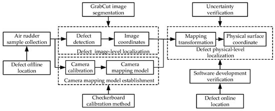 Air rudders are critical structural components in the aerospace industry, playing a pivotal role in controlling an aircraft’s flight attitude. These components operate under high-temperature and impact load conditions, necessitating stringent requirements for structural integrity, material properties, and geometric accuracy []. The manufacturing process of air rudders encompasses composite material compression moulding, heat curing, and cutting, during which significant changes occur on both the surface and interior of the components []. These changes often result in surface defects, which can severely impact the air rudder’s functionality, diminish material strength, shorten its service life, increase the risk of damage during operation, and pose significant threats to flight safety []. Locating the surface defects of air rudders can effectively reduce the risk of using unqualified air rudders and repair and treat the discovered surface defects to ensure that the air rudders meet product standards, minimize resource waste, and reduce scrap rates. An intelligent positioning method is used to locate surface defects generated during the production stage of aviation rudders. Compared with traditional manual measurement methods, it avoids the influence of subjective factors on the positioning results and improves the real-time performance of defect positioning. Compared with precision measuring instruments such as coordinate measuring machines, it is simple to operate, is low cost, has high cost performance, and has strong generalization ability. Accurately and efficiently locating air rudder surface defects can improve the air rudder qualification rate, reduce production costs, and provide valuable guidance for subsequent repairs and manufacturing process optimization []. The first part of this article describes the background of the generation and localization of air rudder defects. The second part discusses related work on defect localization and the contributions of this article. The third part elaborates on the defect localization method based on the camera mapping model. The fourth part presents experimental validation based on this method. The fifth part discusses this article, and the sixth part summarizes the work and provides outlooks.