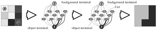 Then, we need to change the cost of the two terminal-shaped connections at pixel and calculate the optimal cut on the new graph. To fit the new “object” seed at the pixel , adding terminal connection weights according to Table 3 makes these new weights consistent with the edge weights of pixels in ; because of the extra constant at the junction of the two terminals of the pixel, the size relationship between weights is not changed, so the optimal cut is not changed.