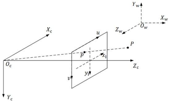 The process of camera image acquisition involves the conversion of physical space points into image pixels through rigid body, projection, and affine transformations. The object being photographed undergoes a rigid body transformation from the world coordinate system to the camera coordinate system, followed by a projection transformation from the camera coordinate system to the physical image coordinate system, and finally an affine transformation to map it onto the linear pixel coordinate system, as depicted in Figure 5.