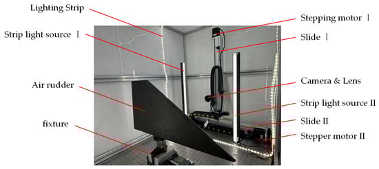 The air rudder used in our experiment is trapezoidal in shape, with a long side length of 624.9 mm, a short side length of 238.7 mm, a height of 310 mm, and a thickness of 53 mm. The experimental platform for air rudder surface defect detection, as depicted in Figure 7, was designed and constructed. It comprises industrial cameras, light sources, fixtures, positioning guide rails, and other components. Additionally, it is equipped with corresponding platform control systems and computer operating systems. The platform incorporates two industrial cameras with lenses, four light sources, and power supply devices. This integrated apparatus offers an effective field of view measuring 700 × 400 mm and is specifically suitable for inspecting the control surface area of the air rudder. Moreover, the platform facilitates various functionalities such as fixed installation of air rudders, adjustment of industrial camera positions, image collection, and transmission to a computer for storage.