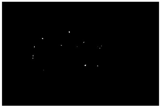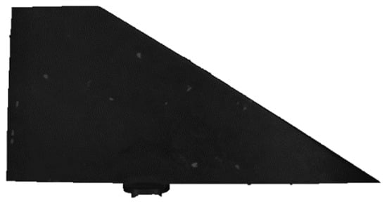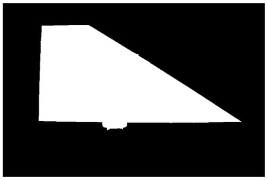 We utilized the GrabCut algorithm for air rudder surface area segmentation, with object seed point set in the rudder surface area and background seed point set in the background area to clarify the image foreground and background range. According to the colour and edge information of the air rudder, the seed points were determined, and the optimal seed points were determined through multiple experiments. The seed points on the front of the air rudder were the upper-left (200, 150), upper-right (350, 150), lower-left (200, 350), and lower-right (650, 350) points; the seed points on the back of the air rudder were the upper-left (500, 150), upper-right (650, 150), lower-left (200, 350), and lower-right (650, 350) points. After 20 iterations, we obtained optimal image segmentation. Based on this segmentation, a boundary is obtained as a segmentation mask, as shown in Figure 9.