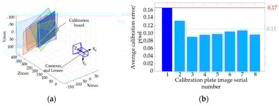 Calibration of the camera’s internal parameter matrix and distortion coefficients: (a) determining the position of the calibration plate in the camera coordinate system; (b) evaluating calibration errors.