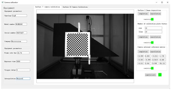 The software camera calibration result is shown in Figure 18. After completing camera location, image preprocessing, and camera calibration, the preprocessed rudder surface image is used to locate defects and obtain the defect coordinates in the image. The camera mapping model transforms these coordinates to the physical surface to obtain accurate location results. The surface defect location results are recorded through images and text and saved in a text document, as shown in Figure 19.