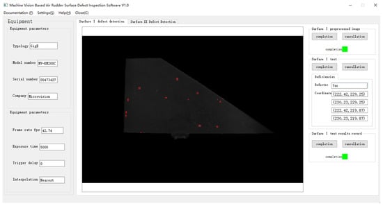 Air rudder surface defect detection and positioning software was developed to verify the positioning accuracy of this defect positioning algorithm in an industrial environment. We conducted functional requirements analysis, designed functional modules according to requirements, developed operation interfaces, and loaded functional modules to realize air rudder surface defect detection and positioning functions. The computer CPU model was Inter(R) Core(TM) i5-6300HQ, and the graphics card model was NVIDIA GeForce GTX 1660M, with 8G running memory and 4G video memory. We used the Python language (https://www.python.org/, accessed on 15 August 2024) and Qt Designer design software (https://www.qt.io/product/ui-design-tools, accessed on 15 August 2024) to develop an operation interface for surface defect detection and positioning functions of the air rudder.