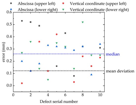 The solution results of the corner point coordinates of the defect bounding box in the air rudder image were compared with the theoretical value of the pre-recorded defect position. The error for each corner point coordinate was obtained, as depicted in Figure 20. It can be observed that there is no significant deviation between the predicted coordinate values from the positioning method and their actual values, with most errors not exceeding 0.5 mm. This defect positioning method demonstrates high precision and accuracy, making it suitable for application in engineering environments while meeting real-time positioning requirements.