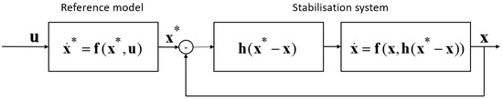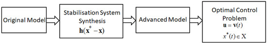 The obtained stabilisation system (11) is inserted into the mathematical model of the control object. Then, the original model (2) is added. As a result, the advanced mathematical model of the control object is obtained: