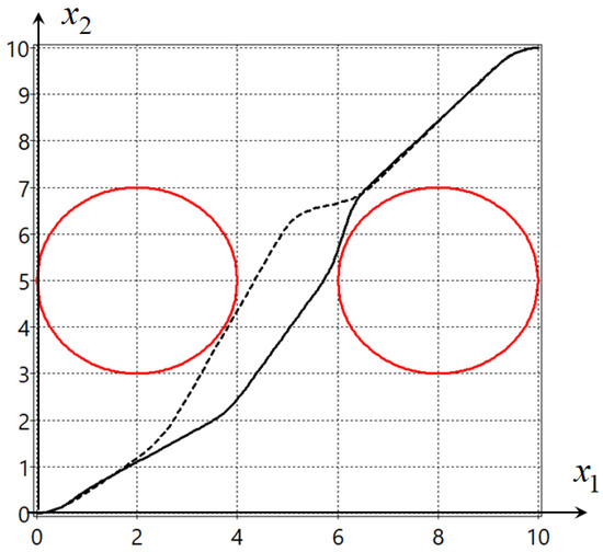 Figure 3 shows the optimal trajectories of two robots. The red circles are obstacles or static phase constraints in terms of control theory. As shown in Figure 3, the found solution is almost optimal because both robots avoided collisions, satisfied the phase constraints, and reached the given terminal states. The quality criterion value of (35) was .