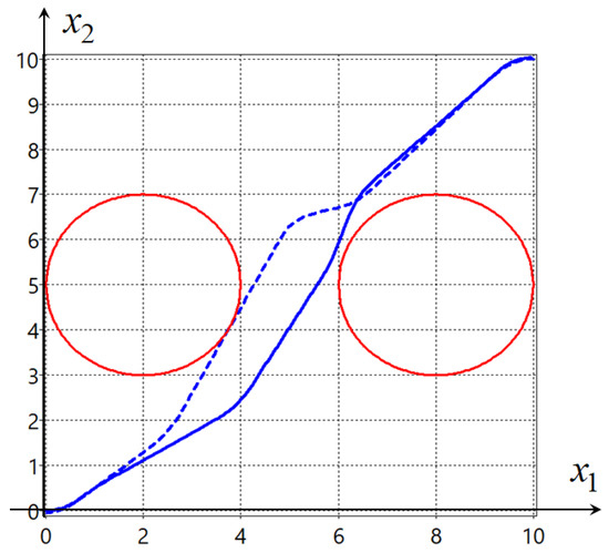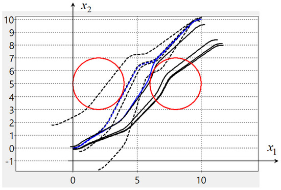 Figure 8 shows the optimal trajectories (79) for robots with the advanced mathematical model with a quality criterion value . Optimal trajectories are marked with blue lines, and obstacles are marked with red circles.