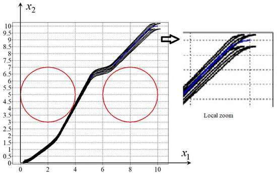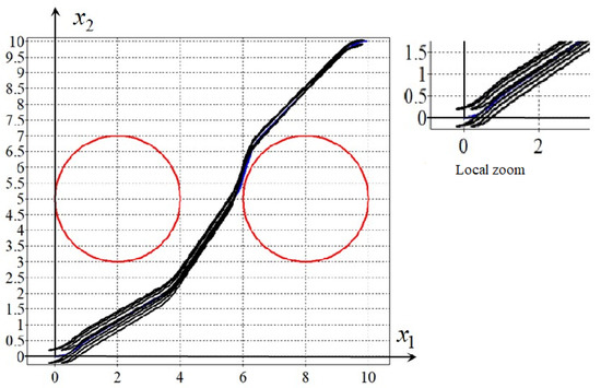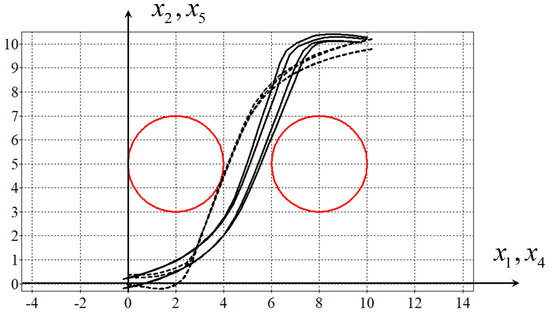 Figure 5 shows the trajectories of two robots with the control system (58) from some initial states. None of the trajectories violate the phase constraints and they almost reach terminal states. The average value of the quality criterion (52) was .