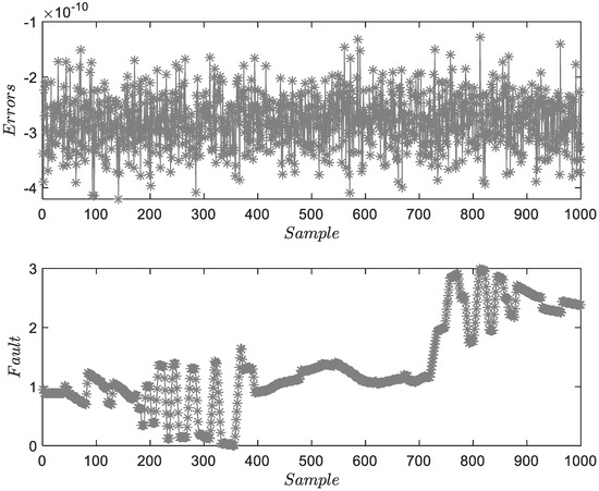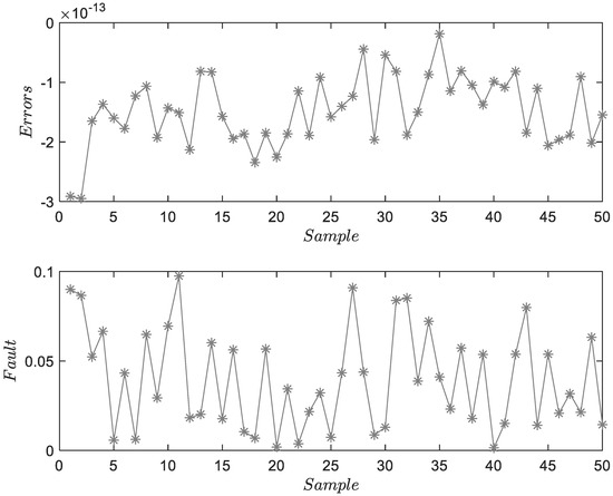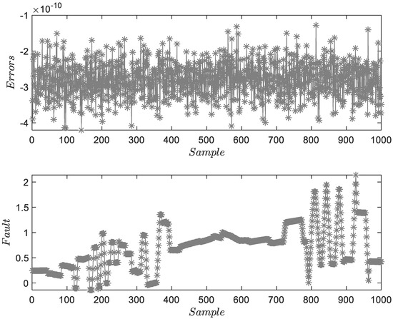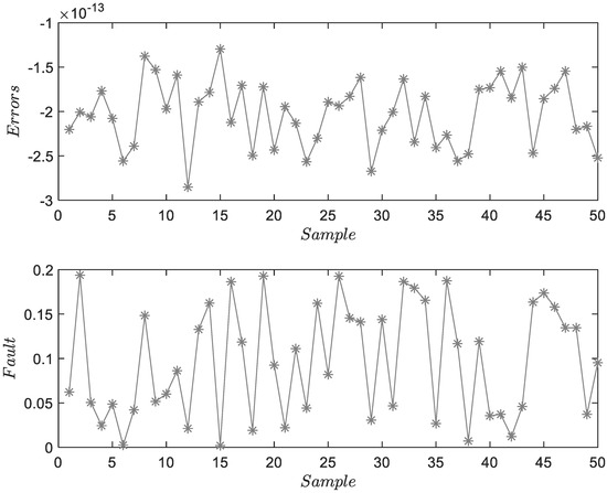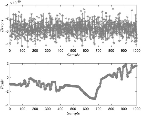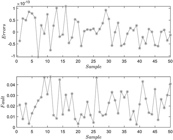 Figure 3 shows the FD and FE results for . The upper subfigure proves the accuracy of system identification. The lower subfigure can illustrate the residuals of FD and obtain the accuracy estimations of . Figure 4 and Figure 5 show the FD and FE results for and . Two figures describe the characteristics of fixed-amplitude faults. Due to the existence of process and measurement noises, the estimation results fluctuate locally. Considering that the amplitude of the fault is much larger than the mean of random noise, the threshold will not be affected. However, under the assumption of colored noise, the threshold needs to be re-optimized.