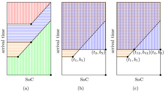 A possible interpretation of is the charging time, while non-zero values of cannot be realized in practice. can be interpreted as an instantaneous loss of charge or an overestimation of battery consumption. Although energy stored in the battery cannot simply disappear, this is allowed by constraint (7). This choice will be useful later, as it helps to expand the set of reachable arrival states as much as possible. Importantly, there is no downside to overestimating battery consumption when considering the feasibility of transitions.