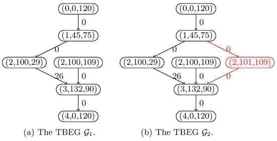 For any TBEG , we can derive a model that, depending on , can serve as an exact formulation of the TBDRP. We use variables for all in the same way they are used in (1)–(10). However, instead of the continuous variables, we now use binary variables for each , which take the value 1 if and only if a vehicle transitions from the arrival state of the tail of a to the arrival state of the head of a.