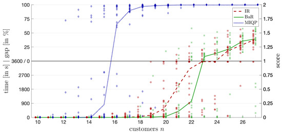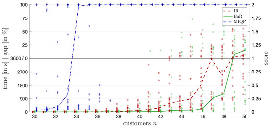 The results of these experiments are shown in Figure 5, where we use the abbreviations IR for Iterative Refinement and BaR for Branch and Refine. For the experiments with 10 vehicles, we followed a similar procedure, but the number of customers ranged from 30 to 50. The results are shown in Figure 6. Each solution method’s run is represented by a marker in the plot, with a transparency of 40%, and the marker’s color and shape indicate the method used. The x-axis of the graphs shows the number of customers, while the y-axis is split into two parts: a lower section for instances solved within 3600 s, and an upper section displaying the gap for instances that timed out.