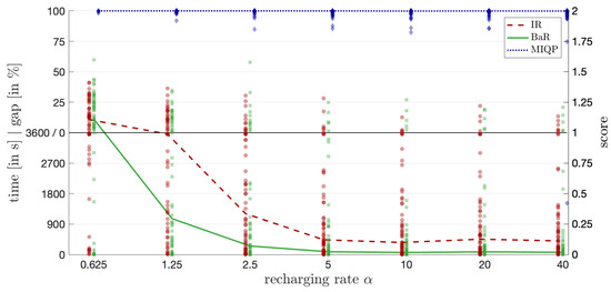 In another computational experiment, we investigated the impact of the recharging rate on the difficulty of the instances. The recharging rate influences how much the battery constraints affect the problem. For very small values of , nearly all the time is spent charging at the depot, while large values of make charging almost instantaneous, meaning the battery constraints impose minimal restrictions on the routes. The results for instances with 3 vehicles and between 20 and 22 customers are shown in Figure 7. The plot layout is similar to the previous one, but the x-axis now represents different values of , and a logarithmic scale is used.