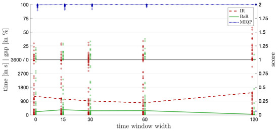 The final set of computational tests studied the effect of the time window width on computation times. We used instances with 20 to 22 customers, a recharging rate of and vehicles. The lower bounds of the time windows were kept constant, and the due dates were set to the lower bounds plus a varying constant that determined the time window width. The results, shown in Figure 8, follow the same plot structure as before, with the time window width displayed on the x-axis.
