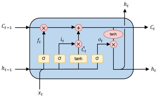 Figure 1 presents the cell structure of an LSTM network. Cell state () represents the component of the model responsible for carrying information forward, with updates managed through a series of gates that determine which information is retained or discarded. First, the Forget Gate (Equation (1)) is responsible for deciding whether to discard past information by processing previous outputs () and current inputs () through a sigmoid layer that generates a value between 0 and 1 to be applied to the previous state (). The input gate (Equations (2) and (3)) is responsible for storing current information. It first determines which information to update in the previous state () through a sigmoid layer and then generates a new candidate vector () in the tanh layer. After determining the information to be discarded or updated through these gates, the cell state at the current time () is updated accordingly (Equation (4)). Finally, the output gates (Equations (5) and (6)) determine the final output () by multiplying the output value () obtained from the sigmoid layer with the value of the cell state () processed through the tanh layer.
