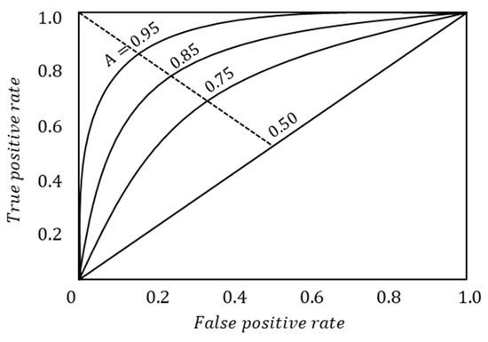 This study utilizes the receiver operating characteristic (ROC) curve to evaluate the effectiveness and optimal cut-off values of the binary classification models. The ROC curve visually represents the relationship between the FP rate (1-specificity; x-axis) and the TP rate (sensitivity; y-axis), allowing for the assessment of model performance across different classification thresholds [26]. The area under the ROC curve (AUC) provides a numerical measure for performance evaluation, with values closer to 1 indicating better model performance. As shown in Figure 2, an ROC curve that approaches the upper left corner of the plot signifies higher accuracy, reflecting a higher TP rate and a lower FP rate.