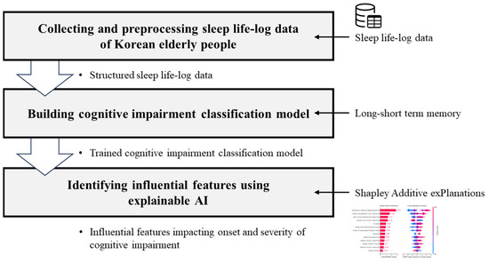 To address these issues, an approach based on lifelog data that enables the collection of real-time information through sensors installed in everyday life was proposed. Lee, Kang [9] trained an artificial neural network (ANN) from sleep and activity data collected from wristbands worn by participants to classify normal individuals and MCI patients. Minamisawa, Okada [10] analyzed the impact of daily activity patterns on dementia by collecting activity data using multiple sensors installed in residential environments. Kim, Jang [11] applied lifelog data collected from patients living in nursing homes to a multilayer perceptron (MLP) to detect abnormal behaviors in patients with dementia. Approaches that utilize lifelog data have the advantage of collecting large amounts of data in real-time, which makes it better to train a classification model. Additionally, the regular updating of lifelog data facilitates the maintenance of predictive models’ effectiveness [12].