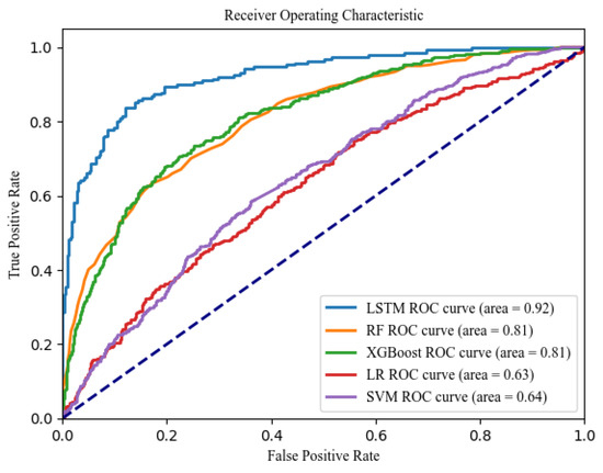 In this study, model performance was evaluated based on sensitivity, specificity, and F1-score. When these values were comparable, we further compared models based on AUC. Sensitivity represents the model’s ability to correctly identify patients with cognitive impairment, while specificity reflects its accuracy in classifying healthy individuals. Overall, the LSTM models demonstrated superior performance compared with other machine learning models. Specifically, the LSTM model trained on the five-day sequence data achieved the highest performance, with a sensitivity of 0.89, a specificity of 0.80, and an AUC of 0.92. Additionally, it achieved an accuracy of 0.85 and an F1-score of 0.85, which are relatively high. As depicted in Figure 4, the ROC curve for the LSTM model is positioned in the upper left corner, reflecting the largest AUC relative to the other models, thus indicating its superior predictive capability for cognitive impairment.