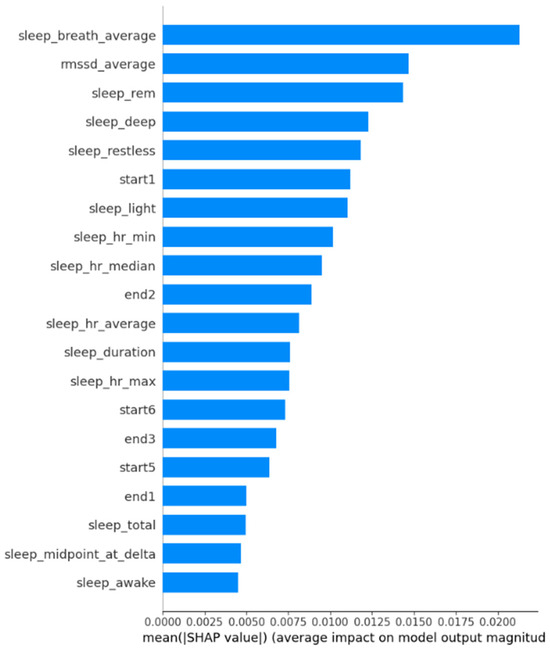 Cognitive impairment is often associated with sleep disturbances, manifesting as day–night reversals, difficulty initiating sleep, and frequent nocturnal awakenings [29,30]. Conversely, alterations in sleep patterns can also contribute to cognitive decline, with key physiological parameters indicative of sleep quality including respiratory rate, heart rate, and body movement [31]. Based on these considerations, 32 sleep factors were selected for model training. As presented in Table 4, sleep factors were divided into two primary categories. Sleep quality features are indicators that indirectly represent a subject’s sleep experience and include attributes such as sleep efficiency, sleep duration, and sleep latency. Statistical features consist of metrics such as one-minute averages, maximum values, and minimum values for factors such as respiration rate and heart rate. For example, the features ‘start’ and ‘end’ refer to indicators that denote the initiation and cessation of sleep within defined time intervals. Detailed descriptions and respective formats of each feature are presented in Table A1.