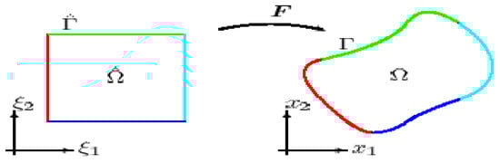 The initial form of isogeometric analysis (IGA) employs a Galerkin formulation within a finite-dimensional subspace of ; this subspace is formed using the same set of B-spline/NURBS basis functions that describe the geometry, aiming to estimate the solution to Equation (27). Consequently, the functional spaces and , where the spaces are pre-defined in Equation (8). Withing this framework, Xh and Mh are defined using the multivariate NURBS functions discussed in Section 2.
