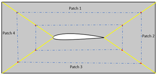 Before integrating Non-Uniform Rational B-Splines (NURBS) within computational fluid dynamics (CFD) to enhance the design and aerodynamic performance of the NACA 2412 airfoil, the primary objective of this research was to evaluate the efficacy of NURBS in improving the precision and flexibility of airfoil geometry representation, thereby optimizing aerodynamic characteristics in this section, and the meshing process used in our analysis is detailed. The NACA 2412 airfoil domain is discretized using NURBS, which are highly effective for creating smooth and accurate representations of complex geometries. Regarding the NURBS meshing setup, the domain is divided into four patches, as shown in Figure 4, each with a polynomial degree of 2 in the u and v directions, ensuring consistent meshing across all boundaries, as shown in Figure 5.