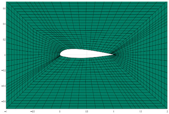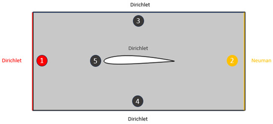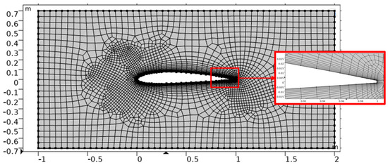On the subject of FEM meshing, as previously stated, the geometry of the problem is a NACA 2412 airfoil with a domain 0.7 × 2 m, and this configuration is commonly employed in the study of aerodynamic phenomena surrounding airfoils (Figure 6). A commercial software is utilized for the generation of the CFD-FEM mesh, which automatically refines the mesh at the airfoil’s surface. A quadratic mesh (prism layer mesh) [16] is used at the airfoil’s boundary layer (see Figure 7) where a lot of important physics happen, so it is important to have a fine mesh here to accurately capture the velocity gradient near the wall of the airfoil {f. For the remainder of the domain, a tetrahedral mesh is employed.