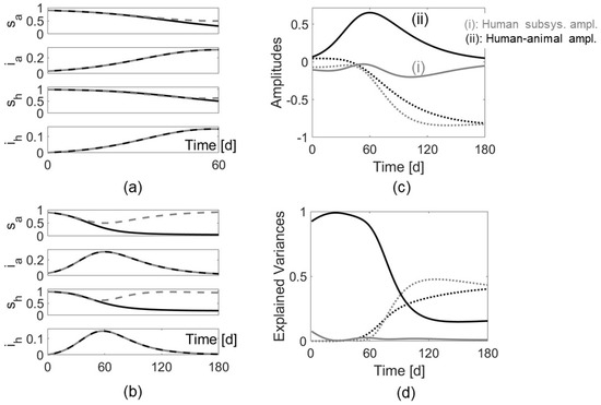 The relative importance of the four amplitudes during different stages of the simulated infection wave can also be explained with the help of their explained variance scores shown in panel (d). Panel (d) shows the explained variance scores for and given as solid black and gray lines, respectively, and and given as dotted black and gray lines, respectively. That is, in panel (d) the same color coding is used as in panel (c). Accordingly, during the first 60 days, the human–animal order parameter amplitude (solid black) explained most of the variance. During the first 20 days, the human subsystem order parameter amplitude (solid gray) also played a role such that during that period the two order parameter amplitudes taken together explain almost 100 percent of the variance in the infection dynamics. After 60 days, the explained variance score of decayed sharply, indicating that stopped playing the dominant role. For that later stages of the wave the neutrally stable amplitudes and explained most of the infection dynamics variance.