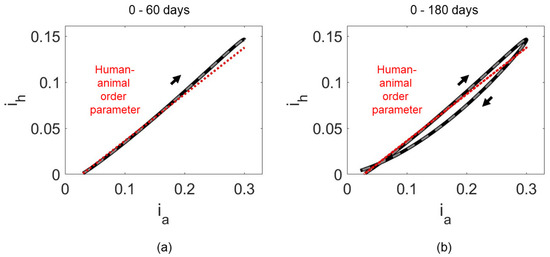 Finally, as mentioned above, for the simulated wave the human–animal order parameter amplitude dominated over the human subsystem order parameter amplitude. Therefore, changes in the population sizes of and should be determined approximately by as described by Equation (43). Graphically speaking, the phase curve in the 2D subspace spanned by and should follow the projection of the order parameter into that subspace. Figure 2 shows the phase curve of the simulated infection wave for the first 60 days (panel (a)) and for the entire simulation period (panel (b)) as solid black lines. The phase curves shown in Figure 2 were drawn from the solutions and presented in panels (a) and (b) of Figure 1. The phase curves were also drawn from the solution given by (see the dashed gray lines). As expected (see Equation (48) again), the phase curves computed from were identical to the phase curves obtained directly from the SIR-SIR model solutions. Importantly, panels (a) and (b) present the projection of the order parameter into the 2D plane of and as red dotted lines. As can be seen in panel (a), the phase curve initially followed closely the order parameter . However, when the infection wave was about to reach the infection peak (i.e., towards the end of the 60-day period) the phase curve started to deviate from . The initial part during which the phase curve followed is consistent with the scenario (ii) approximation shown in Equation (47). The deviation from at the end of the 60-day period demonstrates the role of the second order parameter . In this context, note again that when taking this second order parameter into account, we obtain the gray dashed line that runs on top of the exact solution. That is, the difference between a phase space dynamics along the red straight line and the actual dynamics indicated by the dashed gray line was entirely due to the contribution of the secondary order parameter: the human subsystem order parameter . Panel (b) demonstrates that for the subsiding part of the infection wave from 60 days to 180 days in crude approximation the phase curve followed the direction defined by (dotted red line). However, deviated clearly from . As argued above, this deviation was due to the the term . In the interval from 60 to 180 days, the amplitude formed a very shallow U-shaped curve (see the solid gray line in panel (c) of Figure 1). In line with this U-shape curve, the subsiding branch of the phase curve in panel (b) of Figure 2 running from the top-right corner towards the fixed point first deviated slightly, subsequently reached a maximal deviation from , and finally approached again the direction specified by . In this context, note that is attached in the 2D space at with , . Consequently, close to simulation stop at days when the phase curve was about to approach the fixed point the phase curve crossed the -line.
