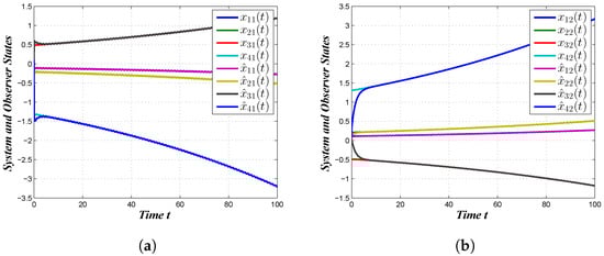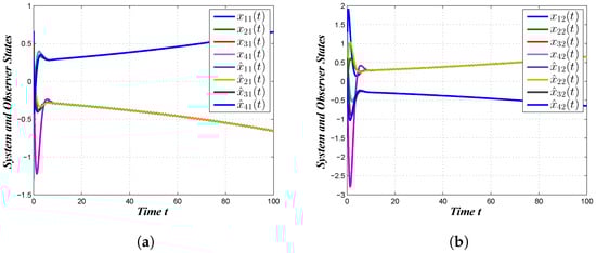 State and observer trajectories with control. (a) , ; (b) , .