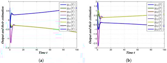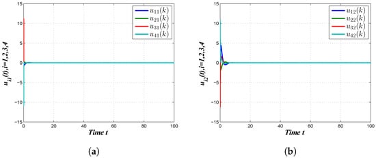 Next, we exhibited the simulation through using the appropriate initial values and computed the gain matrices. Figure 3a shows the plotting of the system and observer state vectors , and Figure 3b describes the trajectories of the state and observer for in the absence of a controller, which clearly describes that the desired bipartite consensus was not reached. On the other hand, the state observer trajectories for and the state observer trajectories for after the execution of the proposed Controller (7) are shown in Figure 4a and Figure 4b, respectively. According to Figure 4a,b, we observed that the desired bipartite consensus performance of the considered MAS was achieved with the proposed Controller (7). Figure 5a,b represent the controller responses of the agents. Figure 6a,b portrait the trajectories of the outputs and their estimations , . Finally, Figure 7a–d show the disturbance tracking performance for the first, second, third and fourth agents, respectively, wherein we can conclude that the required disturbance estimation performances were achieved. From the above discussion, it was observed that the derived results were sufficient for MAS (1) to reach bipartite consensus.