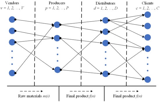 This study develops a model that considers discount policies under demand uncertainty. The model uses a multi-echelon multi-product multi-period SC network system. The SC network (illustrated in Figure 1) consists of 4 echelons, which are vendors, producers, distributors, and clients. This paper inherits the model of Lin et al. [21]. However, we have excluded batch production and capacity expansion to simplify the model and focus on the core aspects. The extension of this model is the integration of an all-unit discount policy.