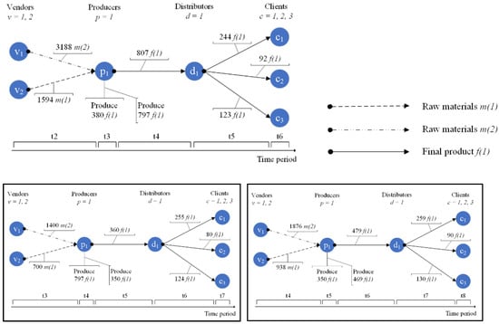 Figure 3 illustrates the flow of the SC network spanning from period to period . To meet the demands of client , , and in period , anticipated at 215, 85, and 130 units, respectively, 740 units of materials and 1480 units of materials are dispatched to producer from vendor and vendor in turn. Despite its higher base price, vendor secures the selection due to its quantity discount offer. This also reduces the procurement cost to 170,796.
