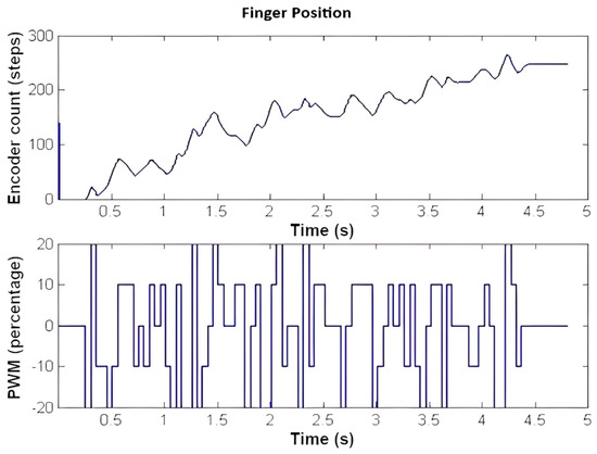 - First, the main system parameters (input and output) must be determined. The input power to the finger motor is established as a system input. The position of the kinematic chain is established as the system output;