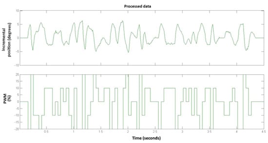 - Second, an input signal must be applied to the system to excite it, which must fulfill a series of properties [22]. Theoretically, the white noise signal could drive the system at any frequency. However, since white noise is a complex signal, an equivalent signal is proposed that complies with the properties established in [22]. That work establishes the required properties and characteristics for an experiment to provide adequate data for a correct system identification. Based on previous experimentation, a pseudo-random signal is selected for identification purposes;
