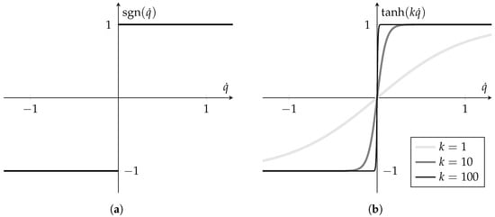 (a) Classical Coulomb friction model. (b) Coulomb–tanh alternative model. The alternative Coulomb–tanh model ensures continuity at null velocity (represented by the variable) and approaches the classical model as k increases.