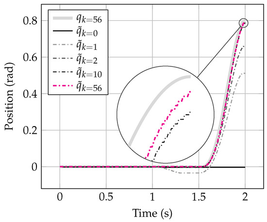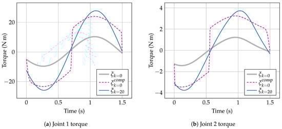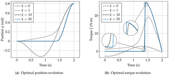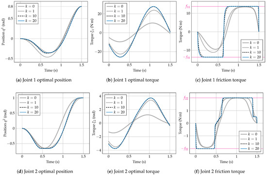 Figure 3 shows the solutions obtained with four different values of k. Note that solutions start reaching a limit curve already for because the corresponding optimal position solution is almost the same as the one obtained for . Indeed, those two corresponding position curves are virtually indistinguishable in Figure 3a. The difference in the corresponding joint torque solutions is a little more perceptible without being overwhelming (see Figure 3b). The torque solution tends to a limit curve in which we expect sharp corners (see Figure 3b). For practical purposes, the solution for might suffice.