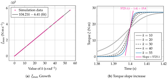 The NDSolveValue solver faces limitations when the hyperbolic tangent function coefficient k, of the chosen friction model (3), reaches high values. The specialized literature of friction modeling and compensation often mentions numerical stiffness to justify issues such as this one, i.e., the difficulty of obtaining solutions with ODE solvers [2]. Classical methods to estimate and measure stiffness generally involve the evaluation of eigenvalues, Jacobians, Lipschitz constants, and norms [44,45]. However, in our specific optimal control example, it is easy to see that stiffness increases just as k increases. Consider Figure 4a: it shows the evolution of the maximum slope at each torque solution obtained for growing values of k. Figure 3b shows that the maximum slope increases with k. This evolution is linear but quite steep: the slope of the fitted model for this evolution is of 104.21 N m s−2. Figure 4b shows a zoom-in around the corners of the torque curves where the maximum slope for the torque curve when is displayed. This maximum slope is of 5725.1 N m s−1, which is very steep. Therefore, we can expect most numerical methods to fail in solving the system (11).