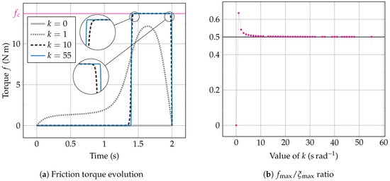 In an extreme case where k could reach a much higher value, the torque curve in Figure 3b would showcase very sharp corners with a maximum slope that tends to infinity. However, considering the maximum torque curve slope, we can conclude that such a value for k already approximates Coulomb’s friction very well in the current situation. Of course, this needs to be verified experimentally. Therefore, the experimental validation of this hypothesis will be presented in the next section.