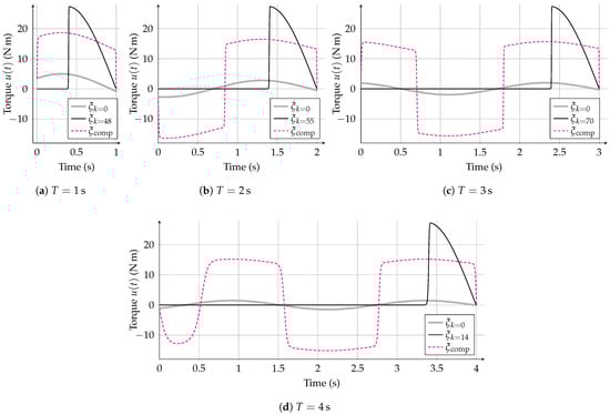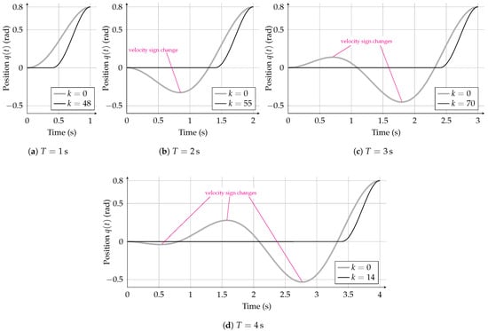 The previous subsection analysis was conducted with a fixed trajectory duration of . However, it was observed that T does have an impact not only on the solver performance (equations become stiffer as T increases) but also on motion characteristics (as observed in [9,13]).