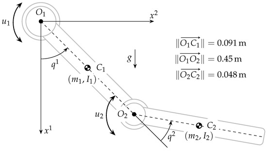 Let us consider a multibody mechanical system described by a finite number of n configuration parameters where . In multibody systems such as these, a joint supports another one on the chain. An actuator ensures rotational joint motion by exerting torque. Q designates the set of states . In the remainder of the manuscript, we shall rely on tensor notation and apply Einstein’s summation convention on repeated subscript–superscript indices [26,27,28]. This is a convention that is used to ease notation in tensor calculus. For example,