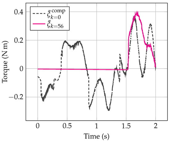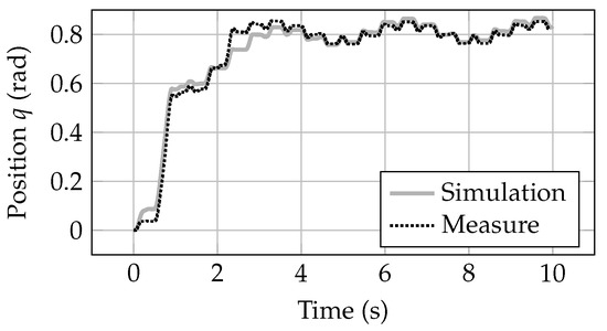 A straightforward enhancement of the selected friction model consists of adding a viscous friction term such as , where denotes the viscous friction coefficient. However, our focus was on dry friction to assess if the selected Coulomb–tanh friction law is actually usable at the optimal planning level. Hopefully, our simulations (Section 3) and experiments (Section 4) convince the reader that Coulomb’s friction can be successfully modeled using the approximate Coulomb–tanh friction law. Note that even if the friction model was considerably enhanced, a precise parameter identification method is still required to increase performance on a real system. It has been pointed out that joint-level friction identification is affected by time [6]. Therefore, the identified parameters vary from trial to trial, even if every other factor remains unchanged. Other ambient conditions have also been reported to negatively affect the parameter identification procedure. Indeed, it is almost impossible to obtain the same friction characteristics in two separate experiments because factors such as temperature and lubricant distribution within the actuator and joint have an (often non-negligible) impact on friction conditions [47]. These problems have been identified a long time ago but remain open. In our case, these issues were minimized by conducting our experiments immediately after identifying the system parameters.