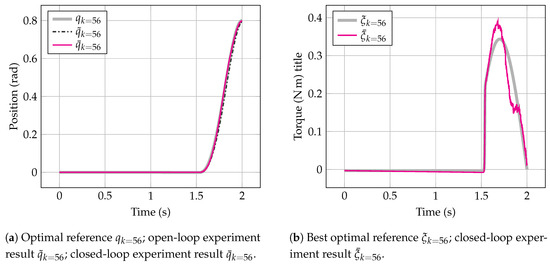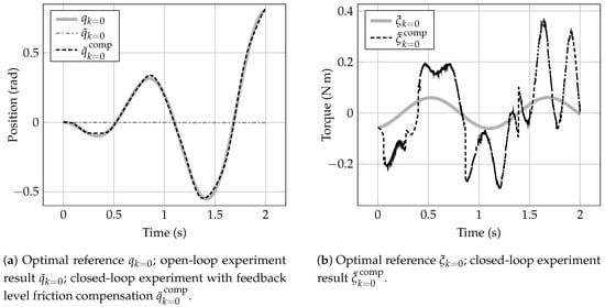 Figure 15 shows the curves obtained for this experiment: system position and required torque for the trajectory. Notice how position tracking was properly achieved using the closed-loop control procedure (18) since curves and are indistinguishable (see Figure 15a). Indeed, the results are now better than those obtained in the scenario where friction is compensated at feedback level (see Section 4.3.2): maximum error occurred at with a deviation of (0.96°). Figure 15a clearly shows when the controller compensates deviations by either increasing or decreasing the input torque value with respect to the optimal reference . Notice how by the end of the experiment, around , the closed-loop torque settles at the desired values. These small deviations are the consequence of unmodeled dynamics and uncertainties. We hypothesize that a more complete friction model would further reduce these deviations.