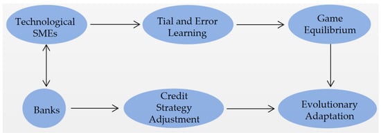 For example, in economics, EGT provides a theoretical reference for the cooperation between banks and enterprises from a unique perspective. The cooperation process between banks and technological SMEs is also a process in which banks and enterprises improve their strategy sets by continuously obtaining information from each other to achieve game equilibrium, as pointed out in Ref. []. Cooperation between banks and technological small and medium-sized enterprises (SEMs) are briefly illustrated in Figure 2. In Figure 2, banks and enterprises belong to the group of limited rationality. Both will maximize benefits and minimize costs through trial and error and adjustment. The bank maintains financial stability by continuously adjusting its credit strategy to achieve optimal returns. The interaction between banks and enterprises resembles biological evolution, involving the adaptation and elimination of ineffective strategies to achieve the final stable state. In the cooperation between banks and SMEs, EGT helps explain the evolution of strategies and guide credit decisions so as to achieve a stable equilibrium.